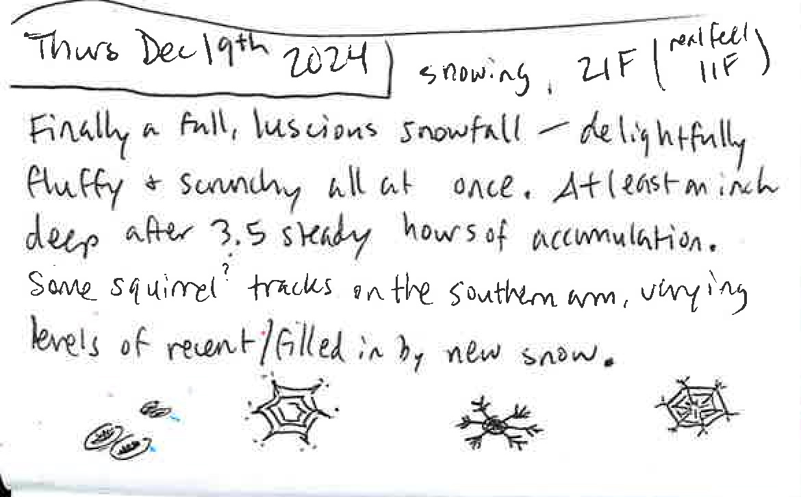 The notepad I used for this experiment lasted through Christmas Day, 2025. I figured it was as good an ending point as any—running out of pages. I kept walking, now freed of the self-imposed pressure to write or sketch about my outings, but it only felt freeing for a week or two before I itched for the pen again. (I mean, how could I not log seeing the world’s tiniest and cutest golden-crowned kinglet with my best friend on New Year’s Day? That’s borderline criminal.)
