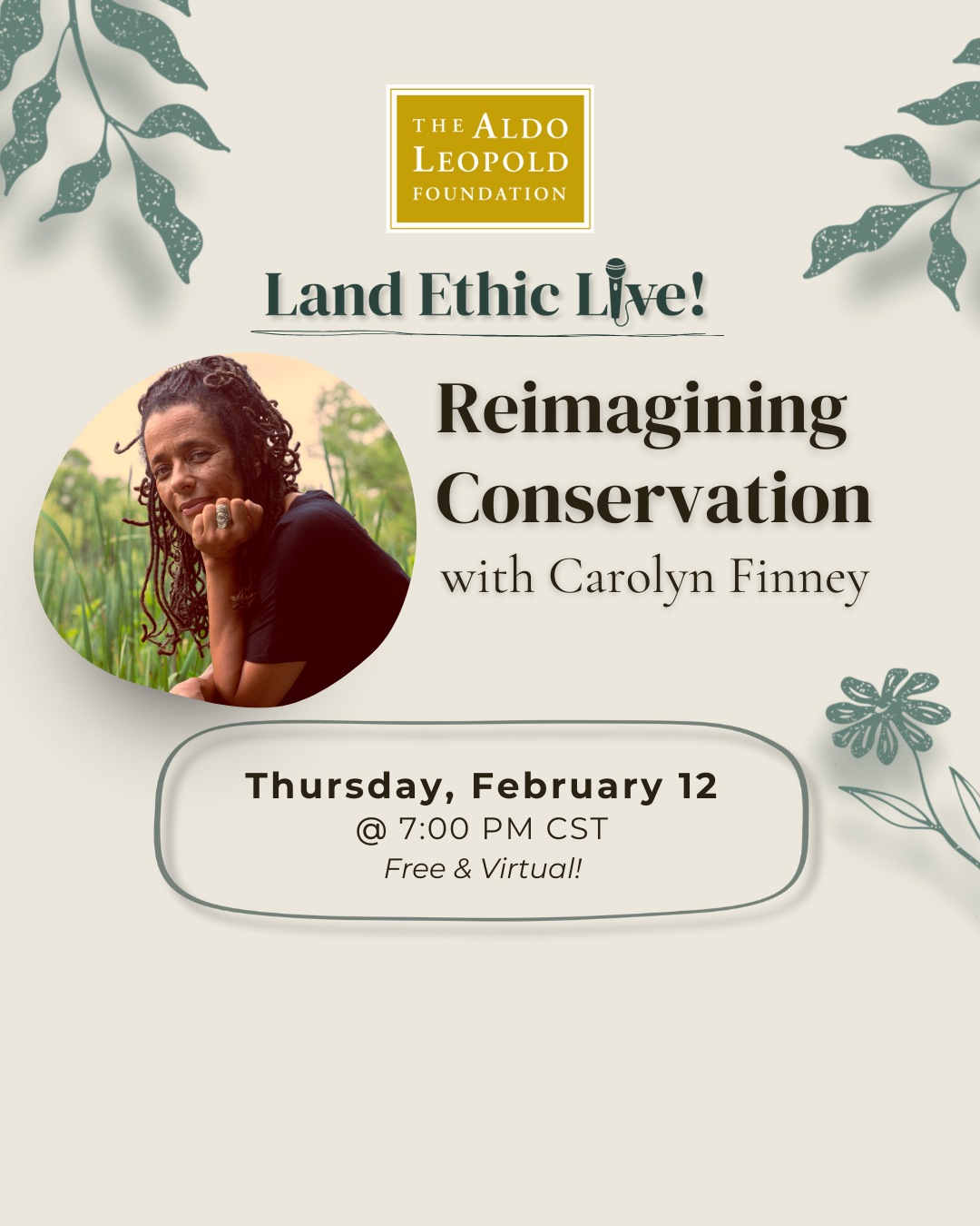 In this Land Ethic Live! conversation, Carolyn Finney invites us to reconsider conservation at a pivotal moment—asking not only how we protect land, but who conservation has been for, and who it must become for in the future. In this conversation, we will explore belonging, power, and historical memory as essential elements of an ethical relationship with land. This program challenges us to imagine a land ethic rooted in justice, inclusion, and shared responsibility for the world we inherit and shape together.